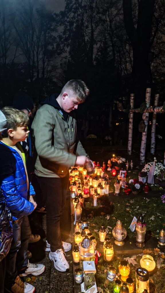 Drugi dzień wyjazdu rozpoczął się wizytą w Sejmie Rzeczypospolitej Polskiej. Uczestnicy mieli okazję zwiedzić gmach Parlamentu oraz spotkać się z posłem na Sejm RP– panem Rafałem Kasprzykiem. Spotkanie odbyło się z inicjatywy Dyrektora Szkoły Podstawowej w Dominikowicach – pana Tomasza Szczepanika, który aktywnie wspiera rozwój postaw obywatelskich wśród uczniów. Młodzież mogła zadać pytania dotyczące pracy posła, procesu stanowienia prawa i funkcjonowania państwa. Następnie uczestnicy udali się do Muzeum Powstania Warszawskiego, gdzie poznali historię heroicznej walki mieszkańców stolicy w 1944 roku. Była to lekcja historii, która głęboko poruszyła wszystkich. Kolejnym punktem programu była wizyta na Stadionie Narodowym, będącym symbolem nowoczesnej Warszawy i miejscem spotkań sportowych, kulturalnych i społecznych. Zwieńczeniem dnia była chwila zadumy na Cmentarzu Wojskowym na Powązkach przy grobach bohaterów książki „Kamienie na szaniec”: Alka, Rudego i Zośki. Uczniowie zapalili znicze, oddając hołd młodym bohaterom, którzy oddali życie za wolność Ojczyzny. Przy tej okazji jeden z naszych uczniów Hubert Krzemiński przybliżył sylwetki wspomnianych bohaterów.