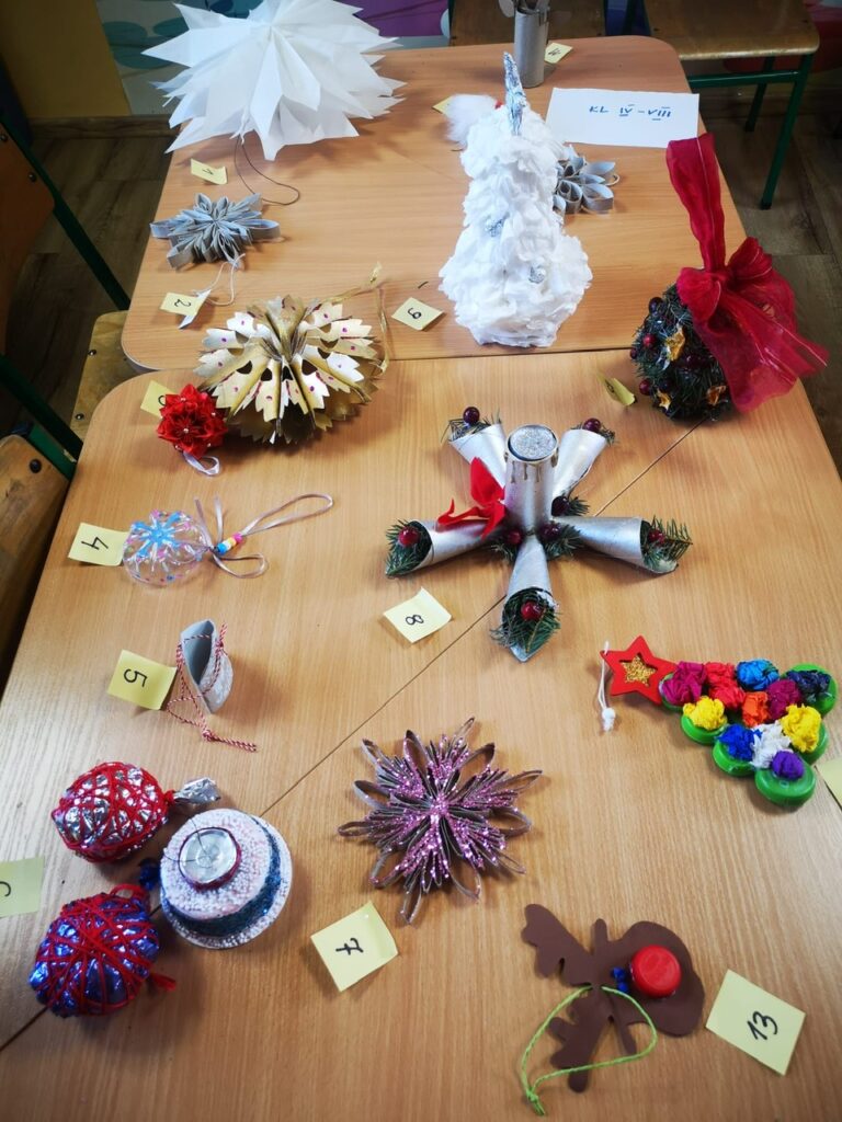 W ramach projektu „Ekoedukacja i działania młodych”, realizowanego przez Stowarzyszenie Kulturalno-Oświatowe Wsi Dominikowice, odbył się konkurs plastyczny pod hasłem „Ozdoba choinkowa z recyklingu” skierowany do uczniów naszej szkoły. Jego celem było promowanie postaw proekologicznych, rozwijanie kreatywności dzieci i młodzieży oraz pokazanie, że z materiałów przeznaczonych do recyklingu można stworzyć piękne i oryginalne dekoracje świąteczne.