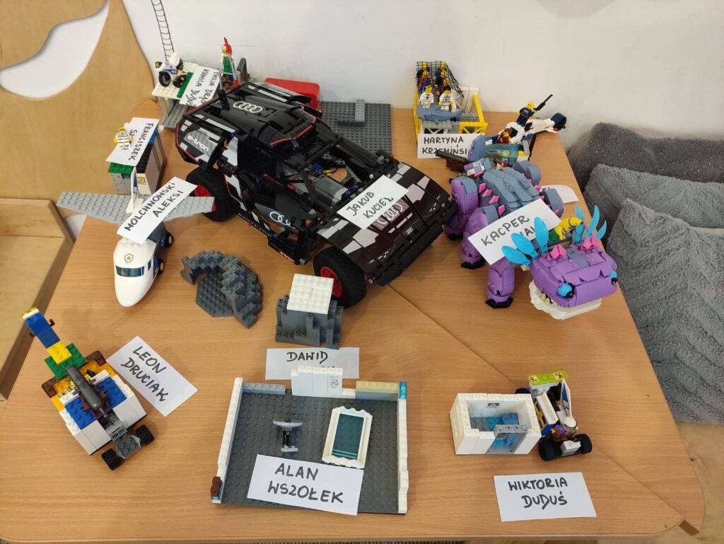 Nasi uczniowie mieli okazję pobawić się mnóstwem różnorodnych klocków – od klasycznych zestawów po tematyczne elementy, które pobudzały wyobraźnię i zachęcały do wspólnej pracy. Największym wyzwaniem dnia okazał się konkurs na najciekawszą konstrukcję LEGO. Każdy uczestnik miał szansę zaprezentować swoją budowlę i wykazać się pomysłowością. Najciekawsze projekty zostały wyróżnione nagrodami, a wszystkie były wystawione w bibliotece. Podczas obchodów przygotowano także wystawę książek poświęconych klockom LEGO i budowaniu – od historii marki, przez pomysły na konstrukcje, aż po opowieści, w których LEGO odgrywa ważną rolę. To doskonała inspiracja do sięgnięcia po literaturę i dalszego rozwijania pasji.