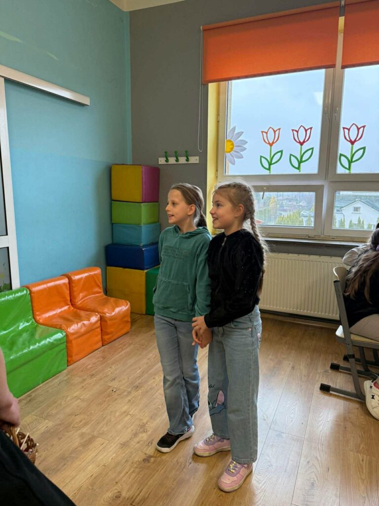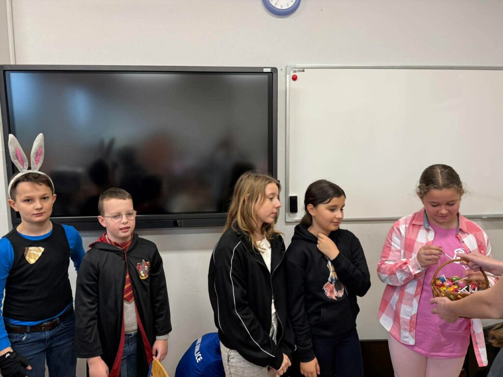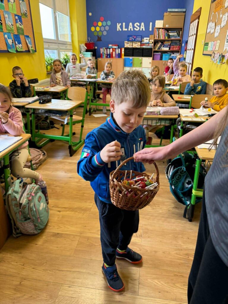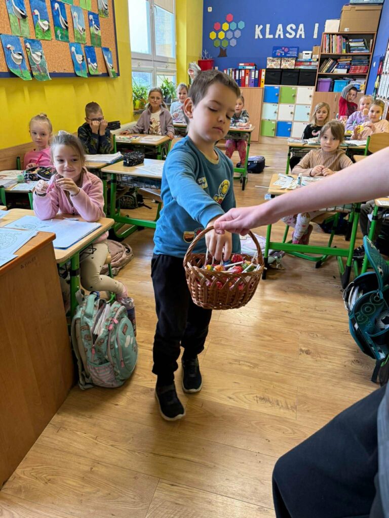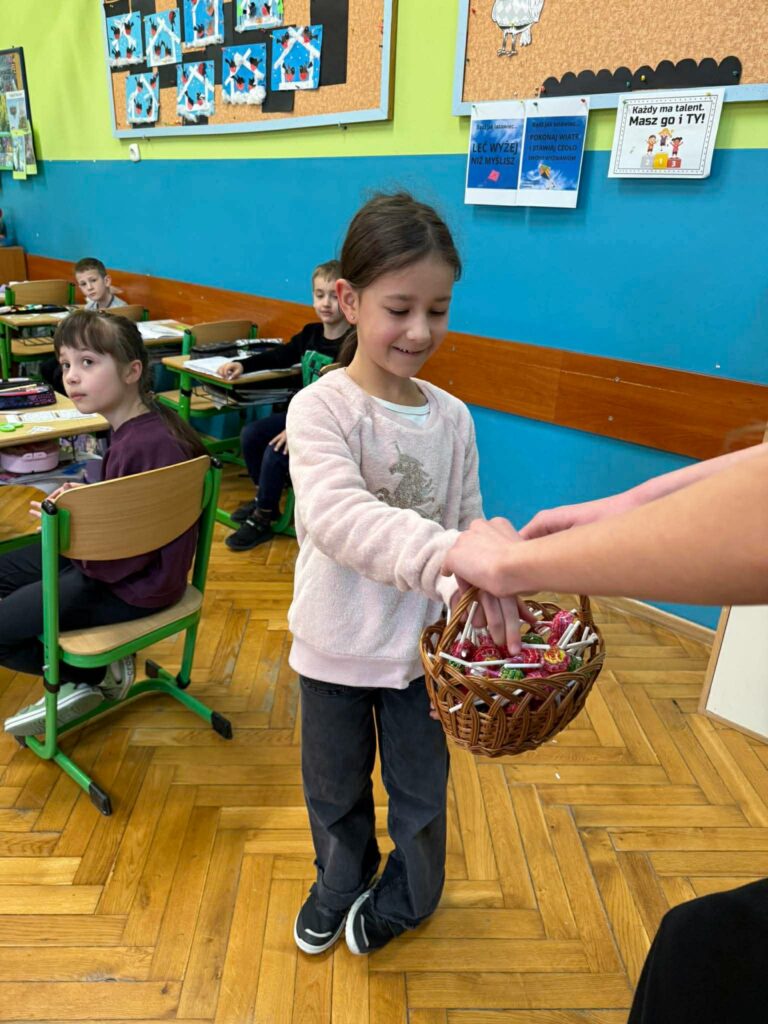 Drugim elementem wydarzenia było „Poszukiwanie Króliczka”, które wprowadziło wszystkich w świąteczny, wielkanocny nastrój. Zadanie polegało na odnalezieniu ukrytych w szkole obrazków z wizerunkiem króliczka. Uczniowie z zaangażowaniem przemierzali korytarze, wykazując się spostrzegawczością i dobrą zabawą. Na uczestników, którzy aktywnie włączyli się w akcję, czekały słodkie nagrody – lizaki, które były miłym akcentem podsumowującym wydarzenie.