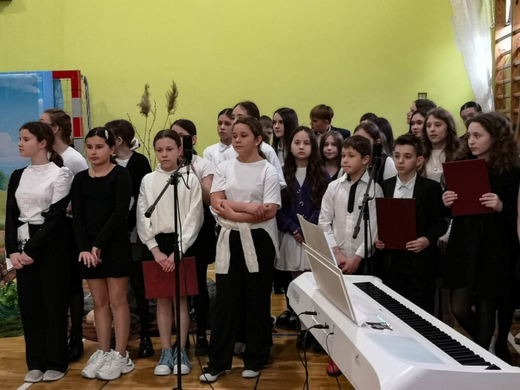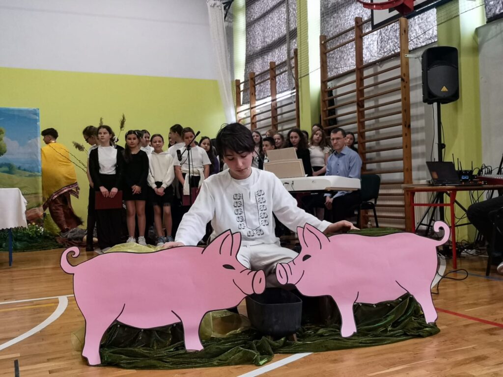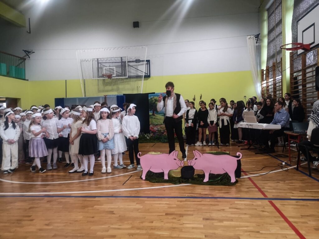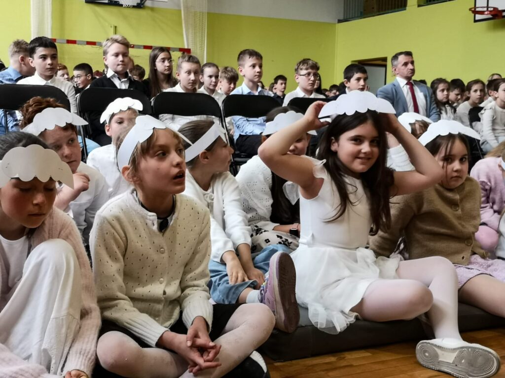 W scenie pierwszej zaprezentowały się także dzieci z edukacji wczesnoszkolnej. Ubrane na biało z własnoręcznie wykonanymi rogami baranimi wykonały piosenki: „Jak dobrze być barankiem” oraz „Pan jest pasterzem moim”. W tym czasie dobry pasterz szukał zagubionej owcy i celebrował jej odnalezienie. Następnie ósmoklasistki wykonały dwa tańce radości z odnalezienia zagubionej w domu monety. Wtedy nadszedł czas na piosenkę „Nie mam nic” przygotowaną przez wybranych uczniów klas IV-V przy akompaniamencie pana Jacka Bartusika. Tak wprowadzeni zostaliśmy do finałowej sceny o Miłosiernym Ojcu, nazywanej również powrotem syna marnotrawnego. Bardzo dosadnie wybrzmiał morał, że radość w niebie nastaje z każdego, kto się nawraca. Ostatnim akordem była piosenka „Jezus najwyższe imię”, po której przewodniczący Samorządu Uczniowskiego, ksiądz i Dyrektor Szkoły złożyli obecnym na sali gimnastycznej życzenia wielkanocne.